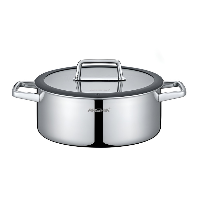 محصولات برند عرشیا تحت لیسانس شرکت Flugel آلمان تولید میشوند. بدنهی این محصولات با استفاده از تکنولوژی لیزری و از سه لایهی مجزا ساخته شده است. - لایهی داخلی از استیل ضدزنگ 304 تشکیل شده که در تماس با مواد غذایی کاملاً ایمن است. - لایهی میانی از جنس آلومینیوم طراحی شده که به انتقال بهتر حرارت کمک میکند. - لایهی بیرونی از استیل 430 ساخته شده که امکان استفاده روی اجاقهای القایی را فراهم میکند و خاصیت شعلهپخشکنی نیز دارد. طراحی چندلایهی بدنه، پخت یکنواخت غذا را ممکن میسازد و عمر بالای محصول را تضمین میکند.
