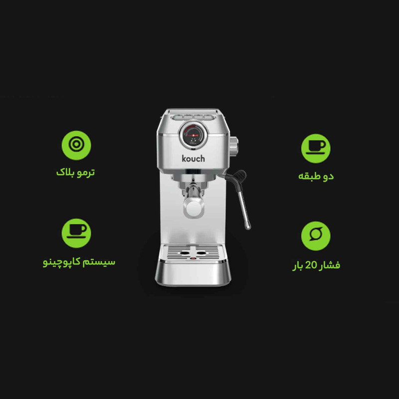 سایر توضیحات | پمپ بار 20 ایتالیایی، توان مصرفی 1450 وات، استمیر بخار حرفه ای جهت تهیه فوم شیر کاپوچینو و لاته و ....، دارای سیستم Thermoblock ثبیت کننده دمای بر سطح قهوه، دکمه تک شات و دبل شات اتومات، دارای صفحه گرم کن فنجان قهوه ،دارای پیمانه و تمپر تمام استیل و پلاستیکی ، صافی تک و دبل دو جداره تمام استیل |