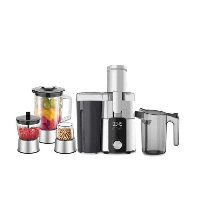 امکانات و قابلیتها | آبمیوه گیری چهار کاره شامل: آبمیوه گیری، مخلوط کن، آسیاب و خردکن ، موتور پر قدرت با توان ۱۰۰۰ وات، دهانه بزرگ با سایز ۸۵ میلیمتر با قابلیت آبگیری یک سیب کاملا درسته، دور موتور در سه سرعت قابل تنظیم، پارچ مخلوط کن از جنس شیشه با گنجایش ۱.۵ لیتر، ظرف خردکن از جنس شیشه با گنجایش ۰.۵ لیتر، ظرف آسیاب از جنس شیشه با گنجایش ۶۰ گرم، تیغه و صافی تماما استیل، موتور با سیم پیچ ساخته شده از صد در صد مس، دارای سیستم ضد چکه، مخزن تفاله بزرگ که براحتی جداشو و قابل شستشو میباشد، پایه های مخلوط کن، خردکن و آسیاب تماما استیل، دارای سیستم قفل ایمنی، قابلیت خردکردن یخ در پارچ مخلوط کن در هنگام میکس مواد، قابلیت له کردن و خرد کردن گوشت، سبزیجات، گردو و … در ظرف خردکن، قابلیت آسیاب ادویه جات، مغزیجات، سبزیجات خشک و …. در ظرف آسیاب |