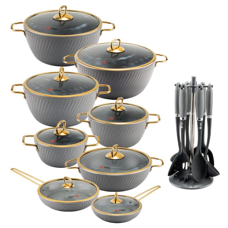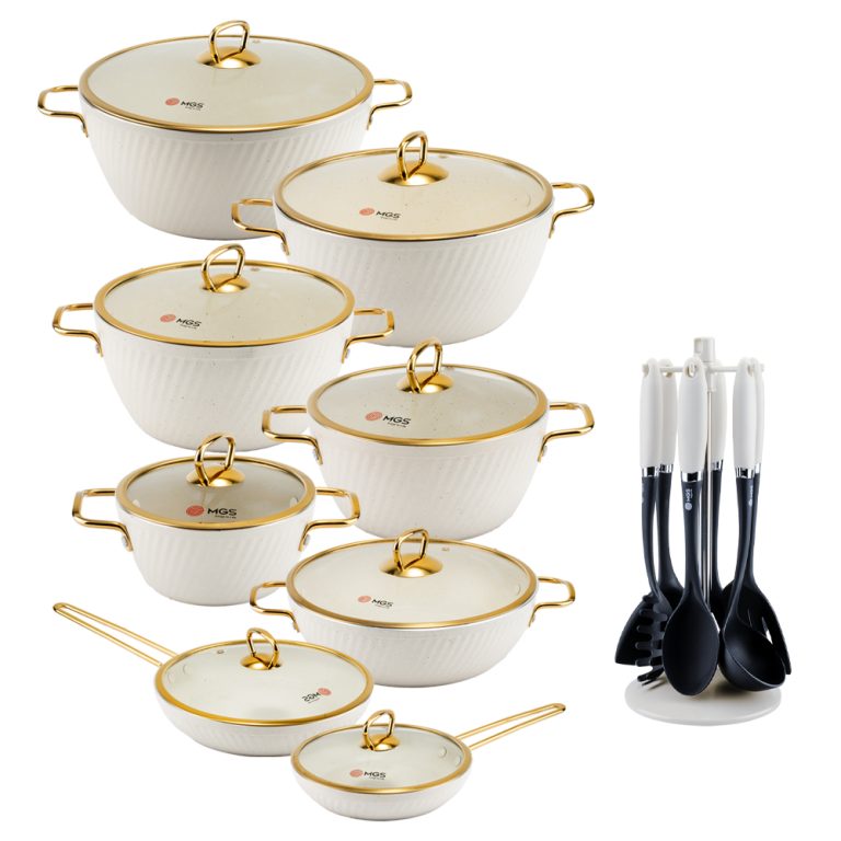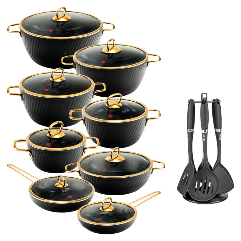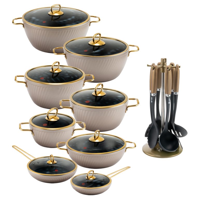 سرویس قابلمه 23 پارچه فورج کد FR04G یک سرویس ظروف پخت و پز عالی برای هر سلیقهای است. این ست شامل پنچ قابلمه در سایزهای 16/20/24/28/32، یک تابه دو دسته سایز 28 و دو تابه تک دسته سایز 24 و 20 و یک ست کفگیر و ملاقه 7 پارچه میباشد.