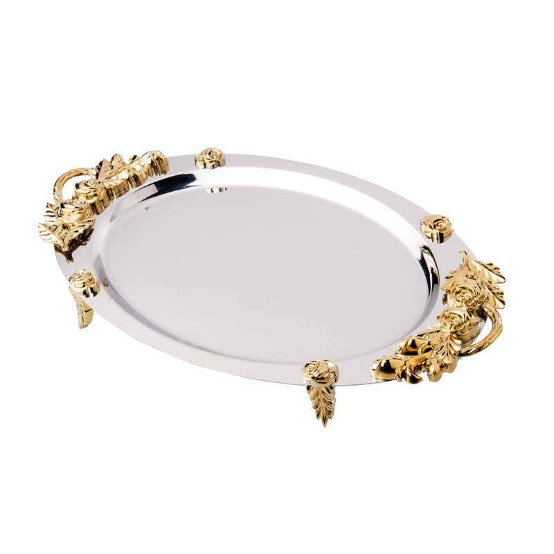 این محصول یک سینی بیضیشکل زیبا و شیک است که از جنس استیل باکیفیت ساخته شده است. ابعاد آن ۴۸x۲۵x۷ سانتیمتر بوده که آن را به گزینهای سبک و کاربردی برای استفاده روزمره و پذیرایی تبدیل میکند. طراحی این سینی با تزئینات طلایی در حاشیه و پایهها، جلوهای لوکس و جذاب به آن بخشیده و مناسب برای مهمانیها و مجالس رسمی است.