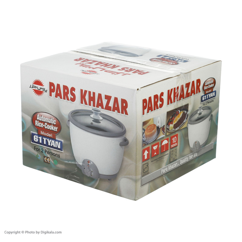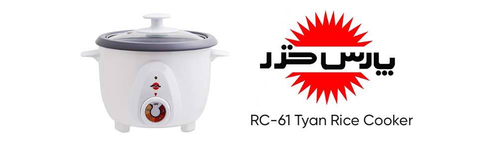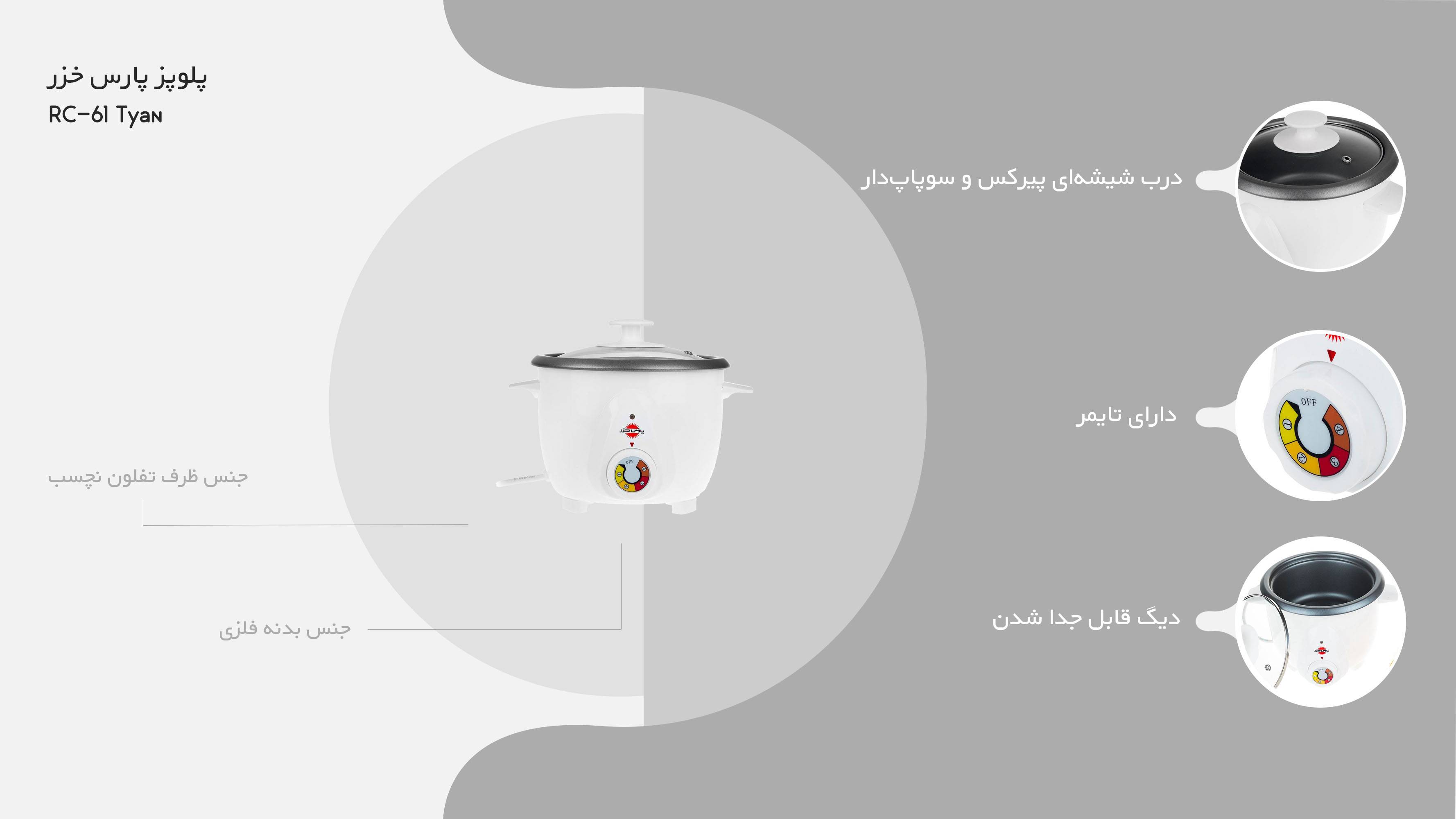 پلوپز پارس خزر مدل RC-61 TYAN دارای در شیشهای پیرکس و سوپاپ دار جهت خروج بخار است. در این دستگاه تایمر و ترموستات با دقت و کیفیت زیاد؛ جهت تنظیم حالتهای مختلف پخت مواد غذایی به کار گرفته شده تا باعث مصرف بهینهی انرژی باشد؛ تنظیم حالتهای مختلف برای پخت مواد غذایی مختلف باعث مصرف بهینهی انرژی شده است. مواد پلاستیکی بهکاررفته در این دستگاه، بهداشتی و مقاوم به حرارت هستند. این پلوپز با ظرفیت 0.6 لیتر امکان پخت برنج برای 2 نفر را دارد . توان این دستگاه 350 وات است. این دستگاه به دلیل قابلیت پخت غذاهای مختلفی مثل برنج، غلات، دسر، تهدیگ، پلو آبکش، پلو مخلوط، سوپ برنج، خورش، آش و انواع خوراک بخارپز مثلاً هویج و کرفس بخارپز شده جزو وسایل کاربردی بهحساب میآید. این دستگاه از بدنهی فلزی و مستحکم بهره میبرد که با رنگ زیبای سفید که نسوز و مقاوم در برابر حرارت است پوشیده و مزین شده است.