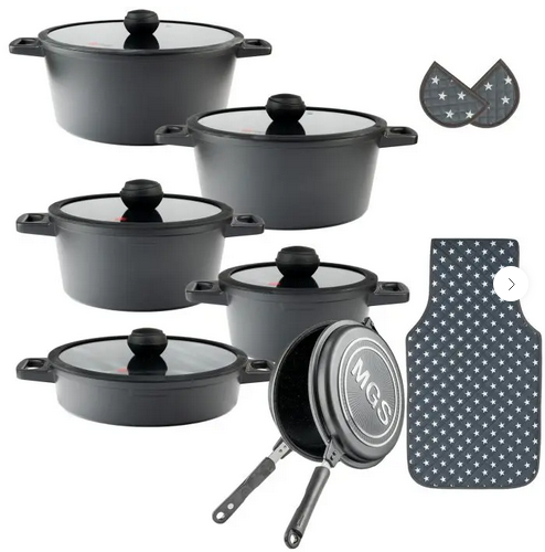 این سرویس قابلمه 15 پارچه جرمنی شامل پنج قابلمه و پنج درب پیرکس بعلاوه یک تابه دو دسته، یک تابه دو طرفه، یک عدد پیشبند و دو عدد دستگیره است. جنس روکش این ست، گرانیت نچسب است. نحوه ساخت این سرویس قابلمه 15 پارچه دایکست و دستههای آن به بدنه متصل است.