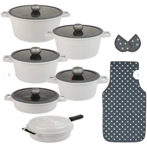 سرویس قابلمه 15 پارچه گرانیت طرح جرمنی E یک سرویس ظروف پخت و پز عالی برای هر سلیقهای است. این ست شامل چهار قابلمه در سایزهای 20/24/28/32 و تابه دو دسته سایز 28 بعلاوه یک تابه دوطرفه، دو عدد دستگیره و یک عدد پیشبند میباشد.