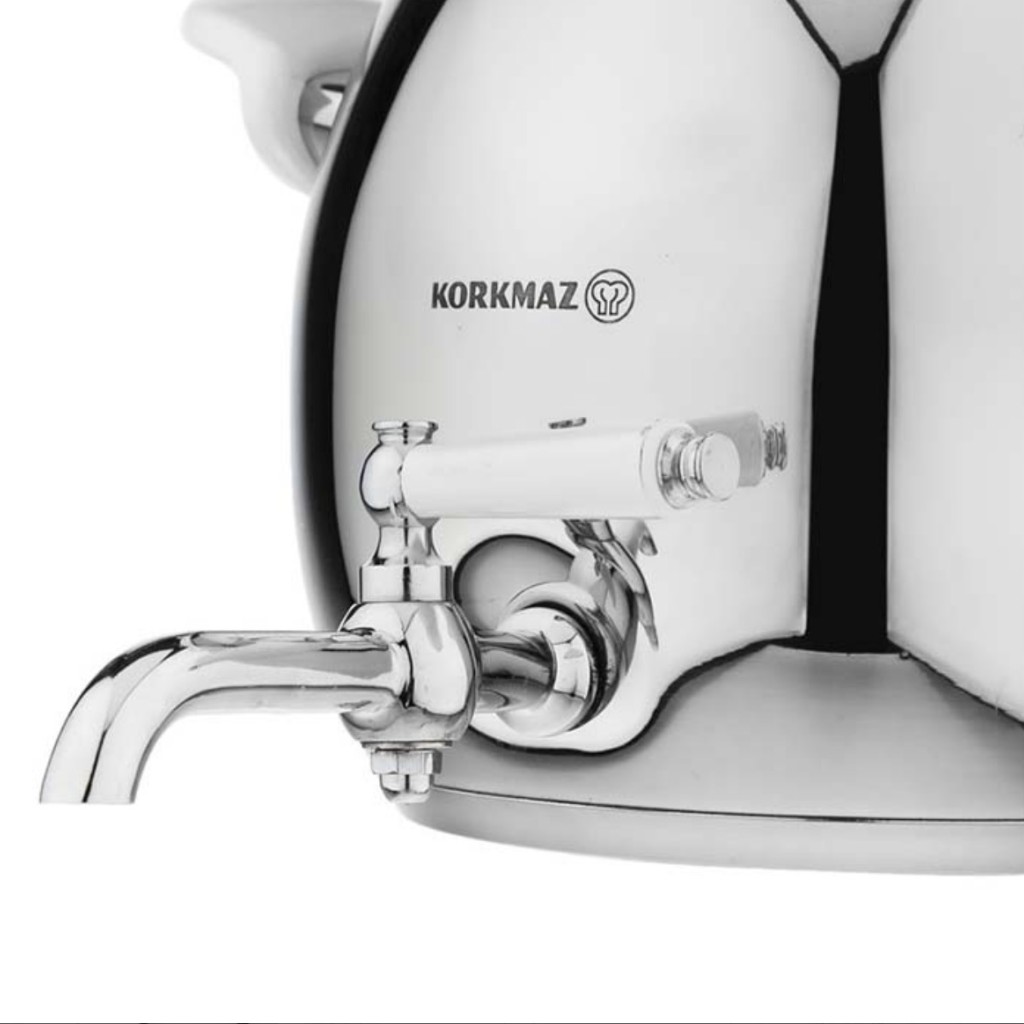 - درب سماور با سیستم کنترل بخار انحصاری کرکماز جهت جلوگیری از سوختن دستها هنگام برداشتن قوری (هنگام برداشتن قوری روزنههای کتری به صورت خودکار بسته میشوند)