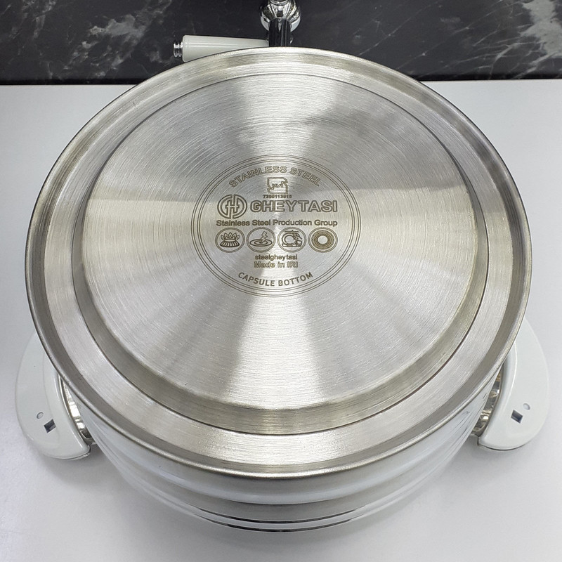 | سایر توضیحات | استیل ۱۸/۱۰ با ضخامت ۱ میلی متر - کفه چدنی سه لایه (Capsule Bottom) و دسته های نسوز - دارای نشان استاندارد و گواهی ISO ۹۰۰۱ |