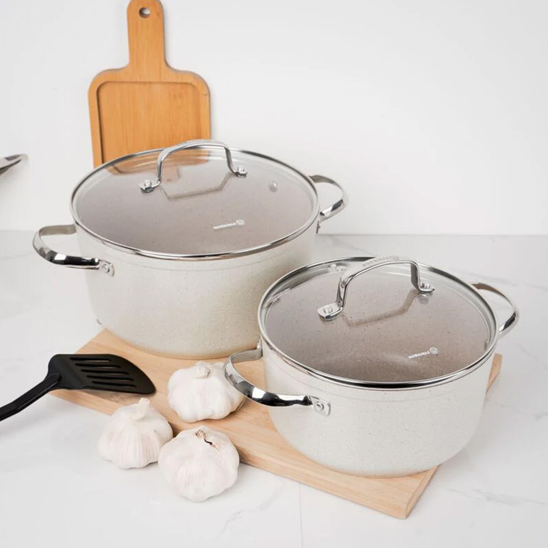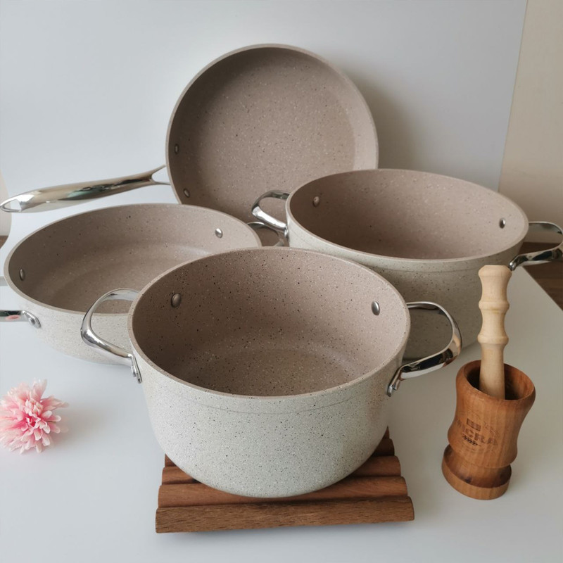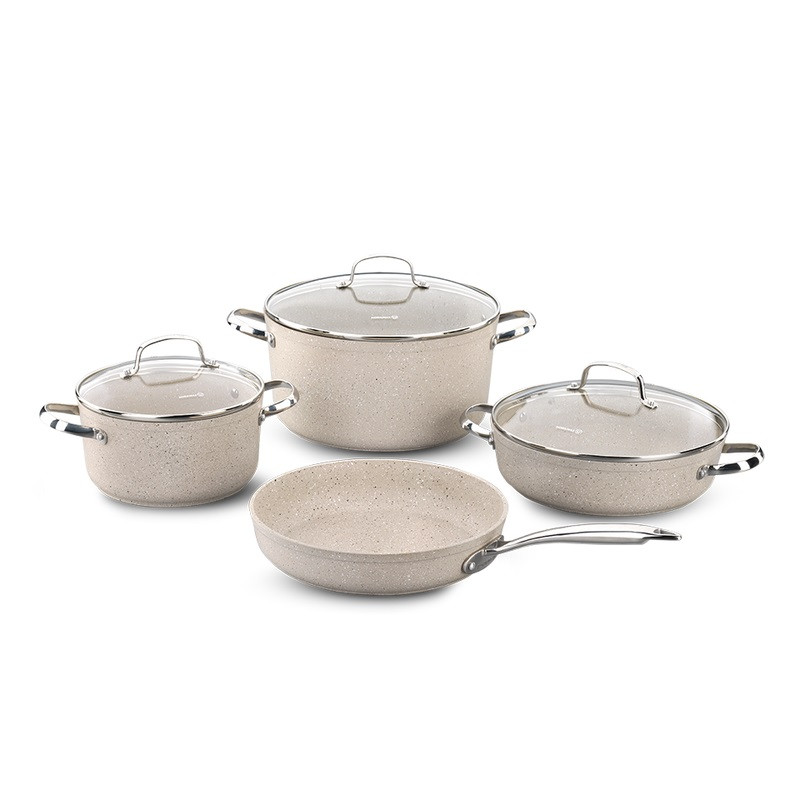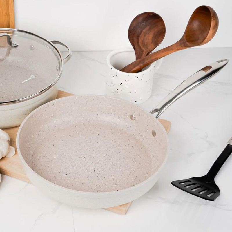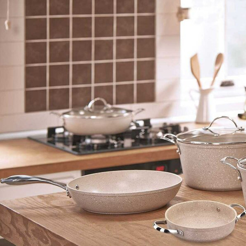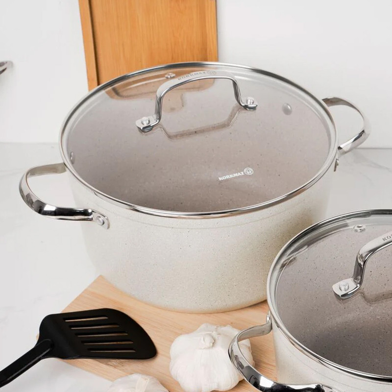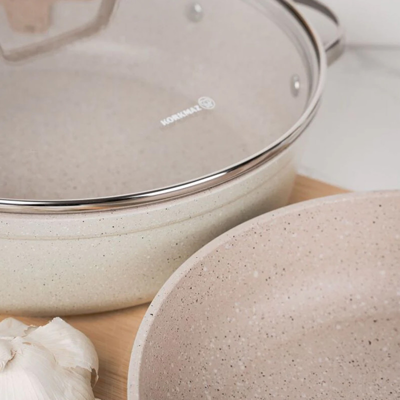 سرویس پخت و پز 7 پارچه کرکماز مدل A1272، محصولی با کیفیت ساخت بالا از برند معتبر ترکیهای کرکماز است که برای ارتقای تجربه آشپزی شما طراحی شده است. ساختار بدنه این ظروف از آلومینیوم ساخته شده که به پخش سریع و یکنواخت حرارت کمک شایانی میکند. روکش داخلی آنها از جنس گرانیت است که علاوه بر ایجاد یک سطح کاملاً نچسب برای آشپزی آسان و سالم، مقاومت بالایی در برابر خط و خش دارد. یکی از ویژگیهای برجسته این سرویس، دستههای استیل آن است؛ این دستهها به صورت پرچ شده به بدنه متصل شدهاند که استحکام و دوام فوقالعادهای را تضمین میکند. این مجموعه ۷ پارچه شامل دو قابلمه در سایزهای ۲۰ و ۲۴ سانتیمتر و دو تابه کاربردی در سایز ۲۶ سانتیمتر به همراه درهای مخصوص است که برای انواع پخت و پز مناسب هستند. این سرویس با اجاق گاز سازگاری کامل دارد. در نهایت، سرویس پخت و پز کرکماز مدل A1272 با ترکیب کیفیت ساخت بالا و عملکرد نچسب، یک انتخاب عالی برای هر آشپزخانهای است.
