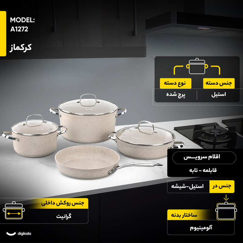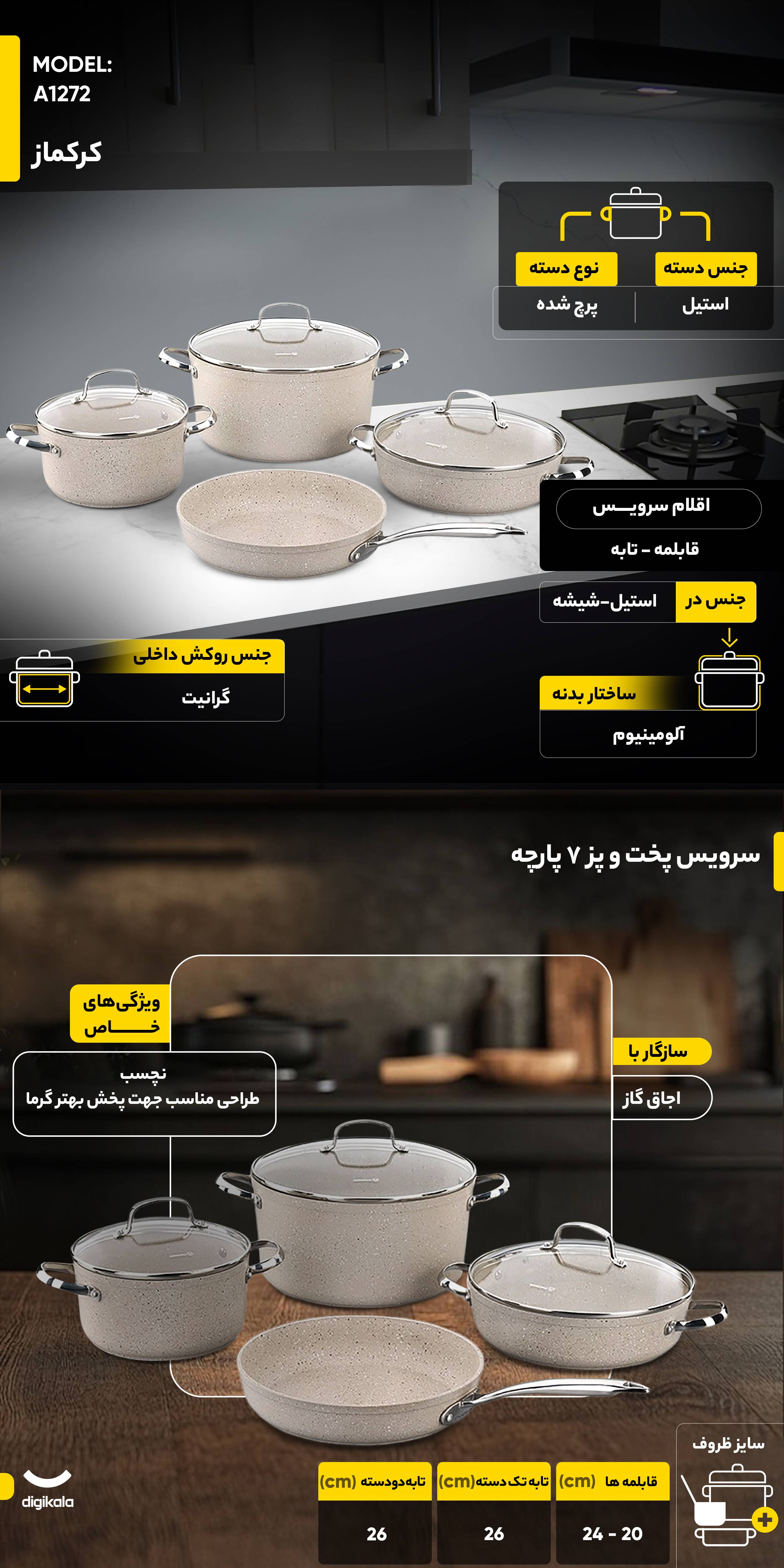 | توضیحات ابعاد قابلمهها | قابلمه سایز ۲۰: 20×10.5×30 سانتیمتر، قابلمه سایز۲۴: 24×12.5×34 سانتیمتر |
