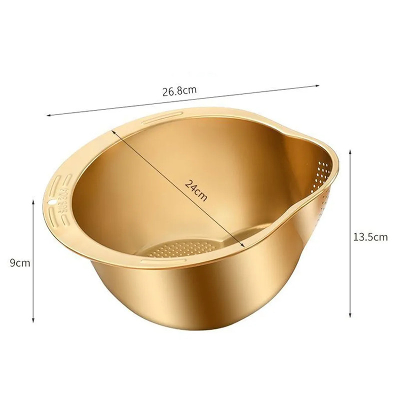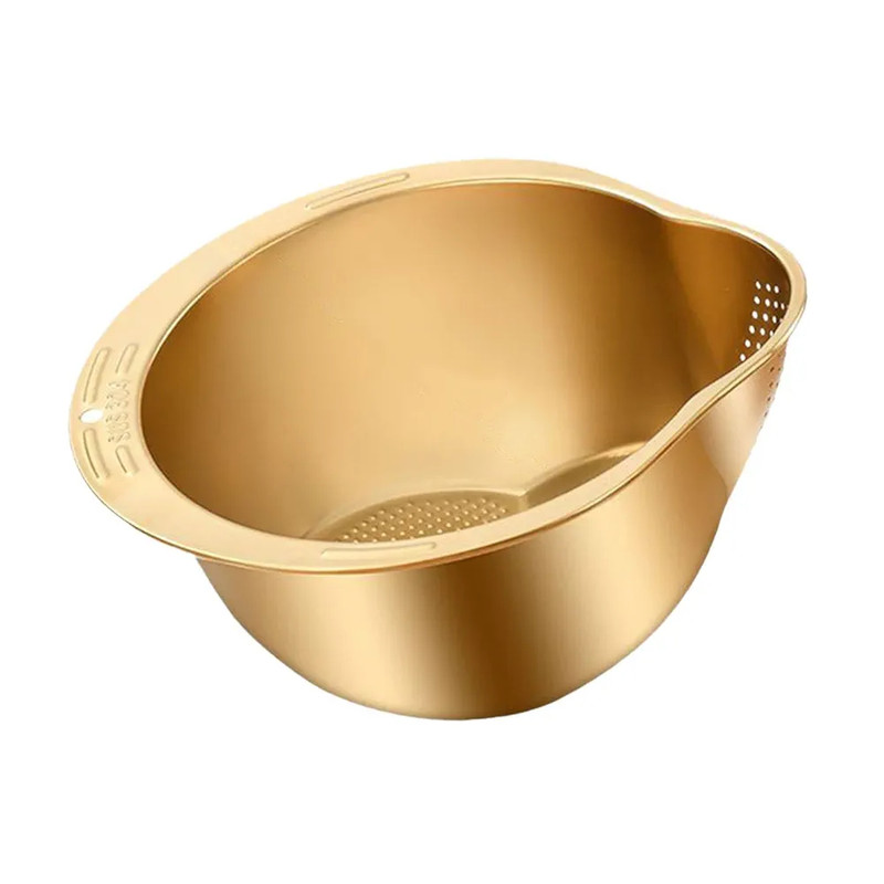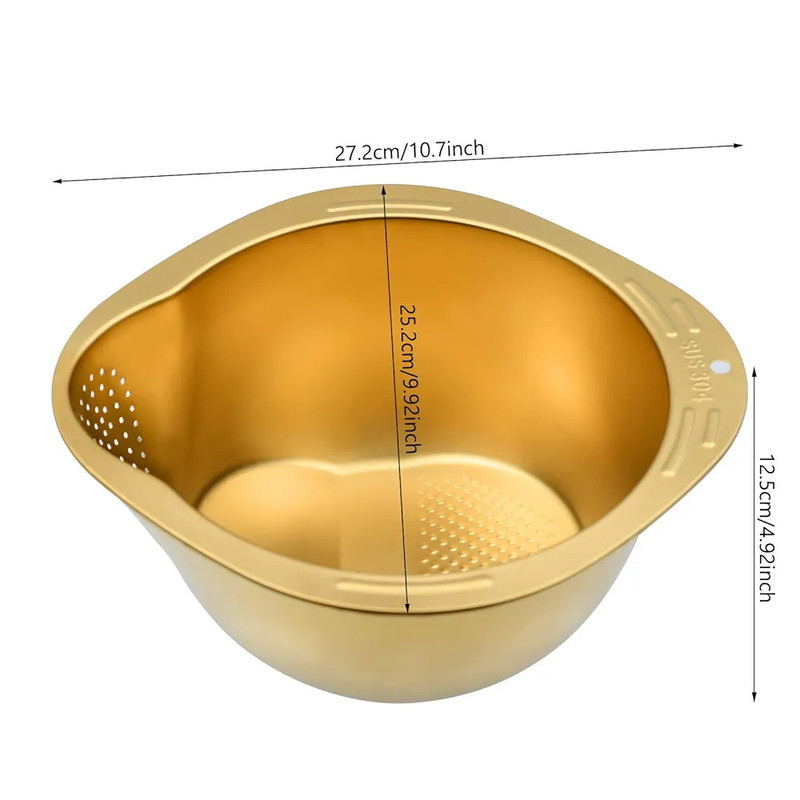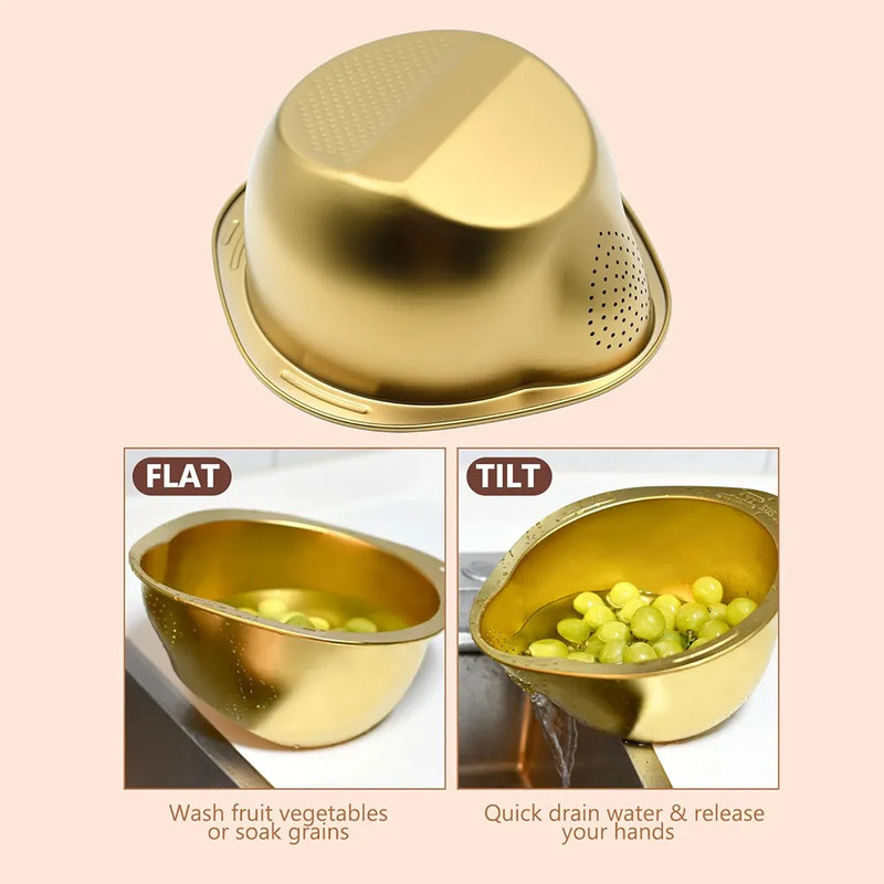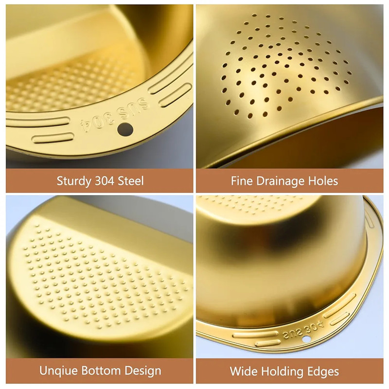 این آبکش طلایی از استیل نگیر 304 باکیفیت ساخته شده که مقاوم در برابر زنگزدگی، خوردگی و تغییر رنگ است. طراحی آن بهصورت دو طرفه بوده و یک بخش دارای سوراخهای ریز برای آبکشی برنج، سبزیجات و میوه است و بخش دیگر برای نگهداری و شستشو بدون ریزش آب. رنگ طلایی براق آن جلوهای لوکس و مدرن به آشپزخانه میبخشد. ابعاد تقریبی: طول 26.8 سانتیمتر، عرض 24 سانتیمتر، ارتفاع 13.5 سانتیمتر (سمت بلند) و 9 سانتیمتر (سمت کوتاه). ویژگیها: جنس استیل ضدزنگ 304 (نگیر) مقاوم در برابر بو و لکه مناسب برای شستشو و آبکشی انواع برنج، سبزیجات و میوه طراحی ارگونومیک و شستشوی آسان ظاهر شیک و بادوام دارد.