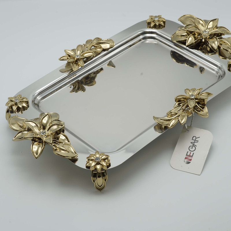 سینی پذیرایی یکی از پر کاربردترین وسایل خانه و آشپزخانه به حساب می آید.سینی پذیرایی نگارطرح لیلیوم با دسته های طلایی نگین کاری شده دارای ورق تمام استیل , ضد زنگ و با ضخامت بالا می باشد. سینی پذیرایی نگار با طراحی بسیار زیبا زینت بخش مجالس شماست.