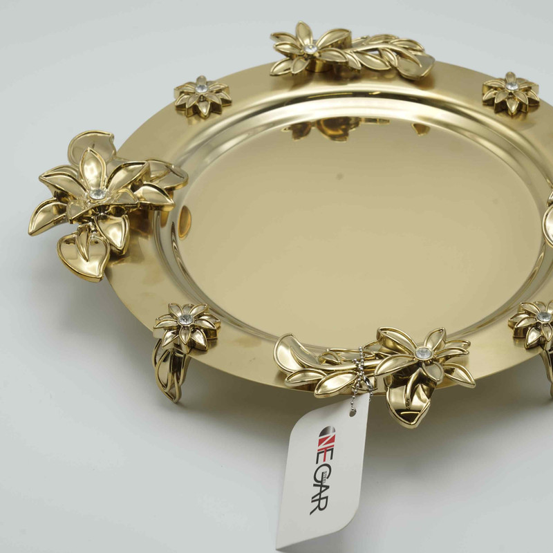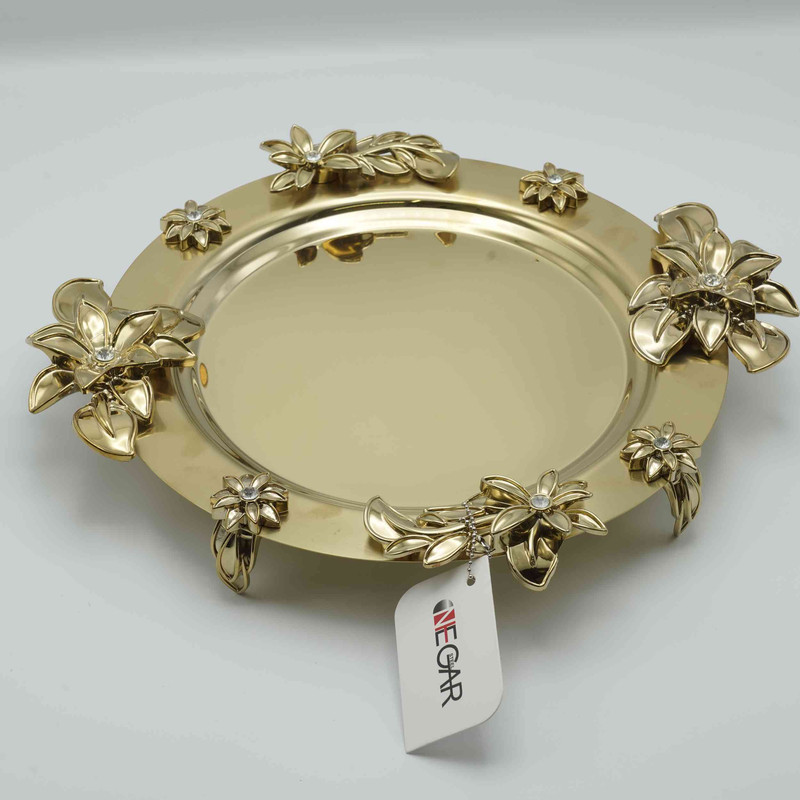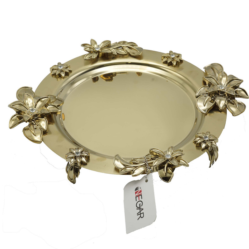 سینی استیل نگار با طرح زیبای یلیلیوم که دسته و پایه ها نگین کاری شده و نمای زیباتری به آن داده است. طول دسته به دسته آن 40 سانتی متر است و کف آن 25 سانتی متر است .